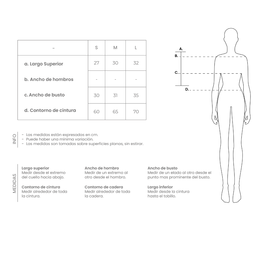 Espalda completamente cubierta y breteles ajustables, con terminación al cuerpo que define la cintura y realza la silueta.